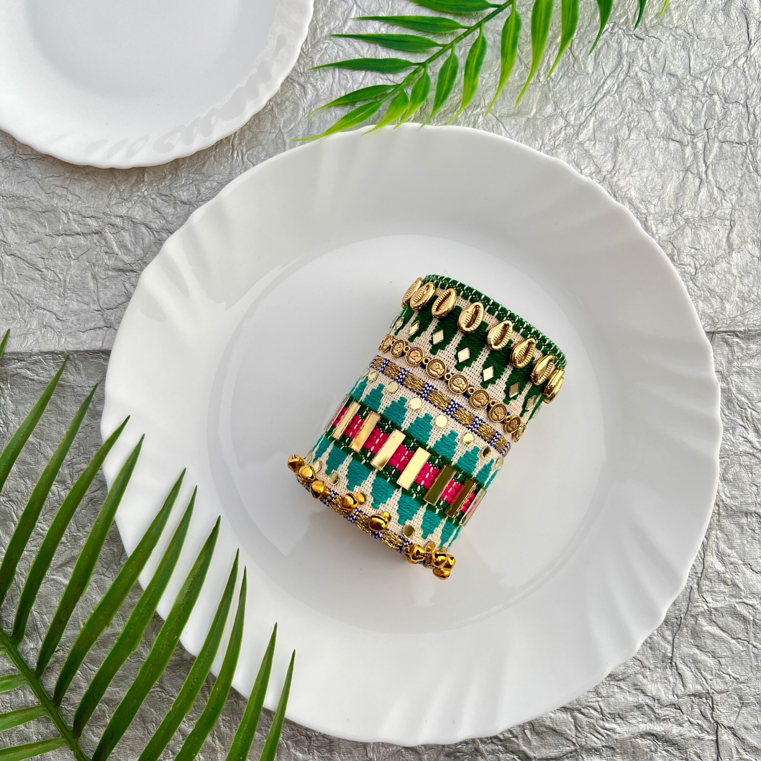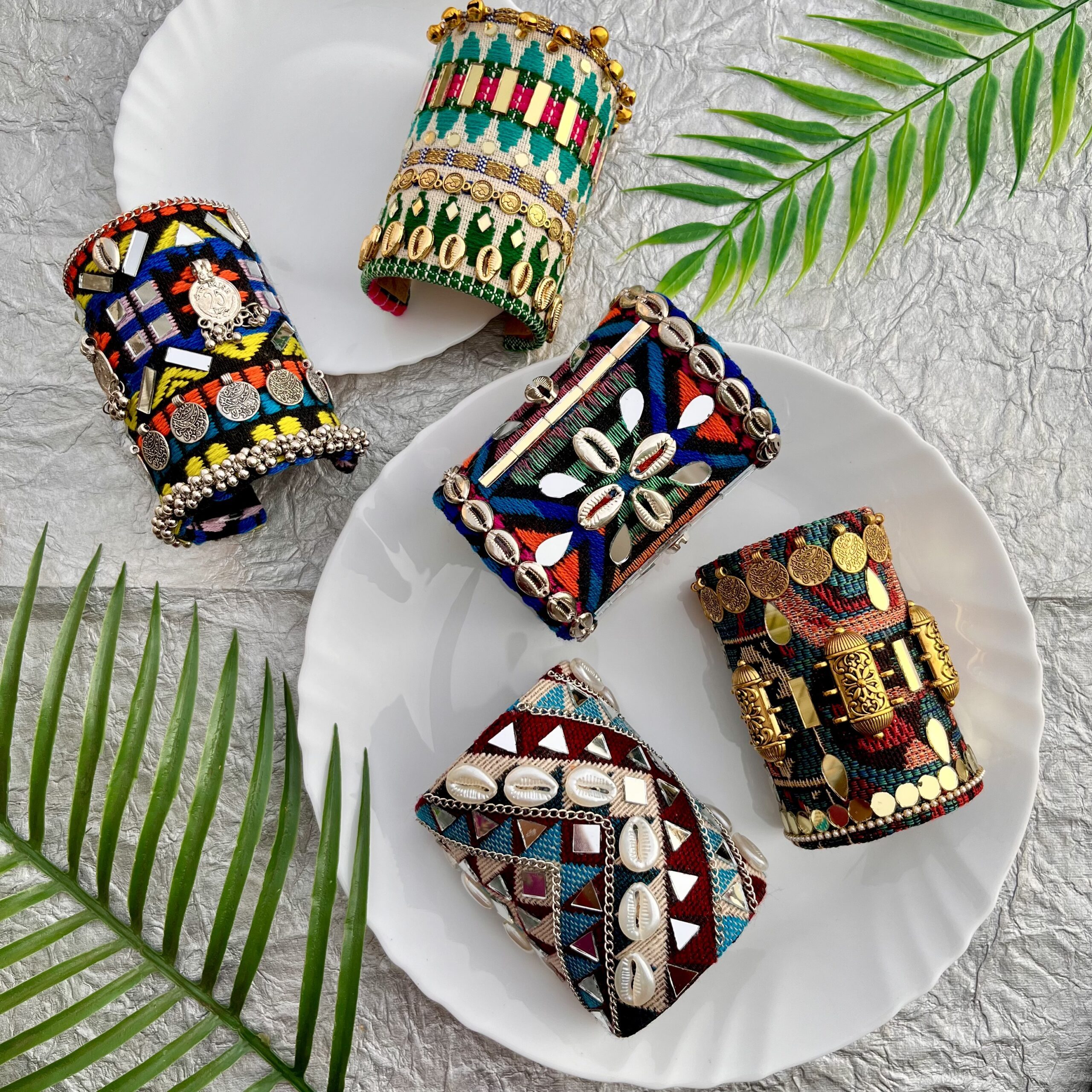 Make a bold statement this Navratri with handcrafted, embellished Boho Aura handcuffs designed to dazzle with ghunghroos, mirrors, cowrie shells and intricate metal charms. Weather you are twirling in your chaniya choli or adding a Boho touch to post festive season, these cuffs are your new go-to accessory.