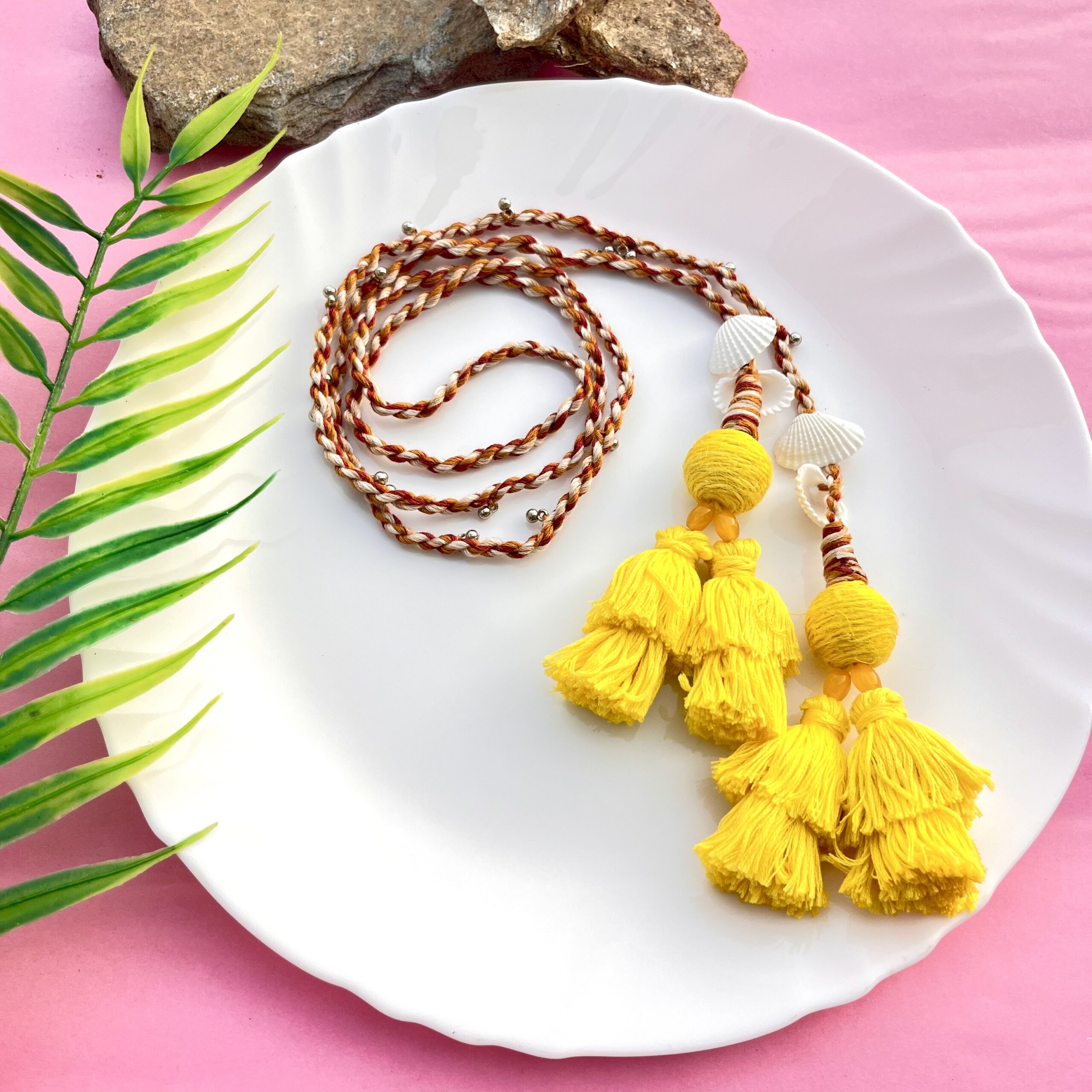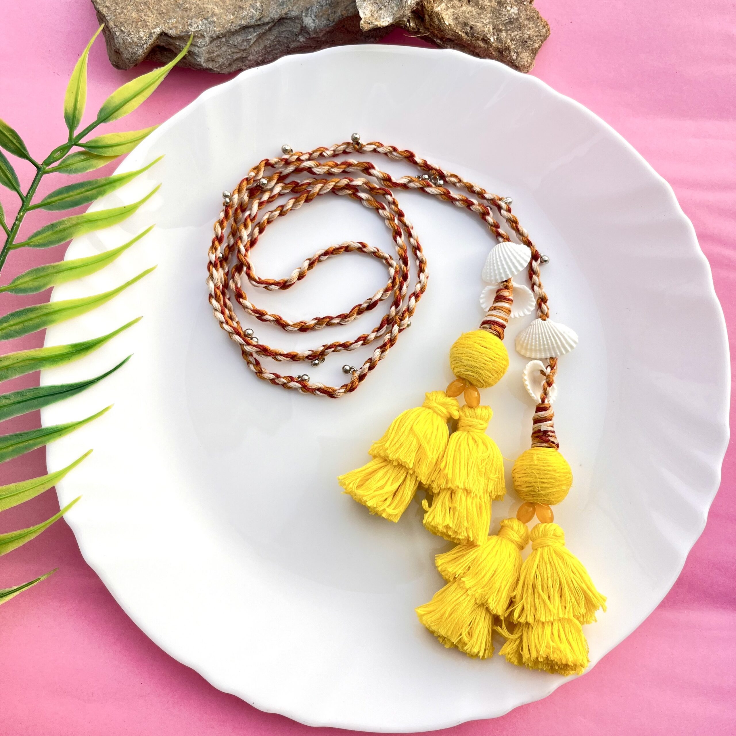 This handcrafted drape paranda with bold yellow tassels and delicate shells is your ultimate braid statement — rooted in tradition, styled for the modern bride tribe. Whether you’re dancing under stars at a mehndi or showing up for your bff’s haldi, this piece is more than an accessory — it’s an emotion. 🌾💛