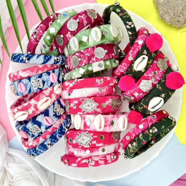 Handcrafted with love — a vibrant mix of printed fabrics, metal charms, mirrors, and natural shells. Each bangle tells its own free-spirited story. 🌿💫 Ready to stack, shine, and wander.