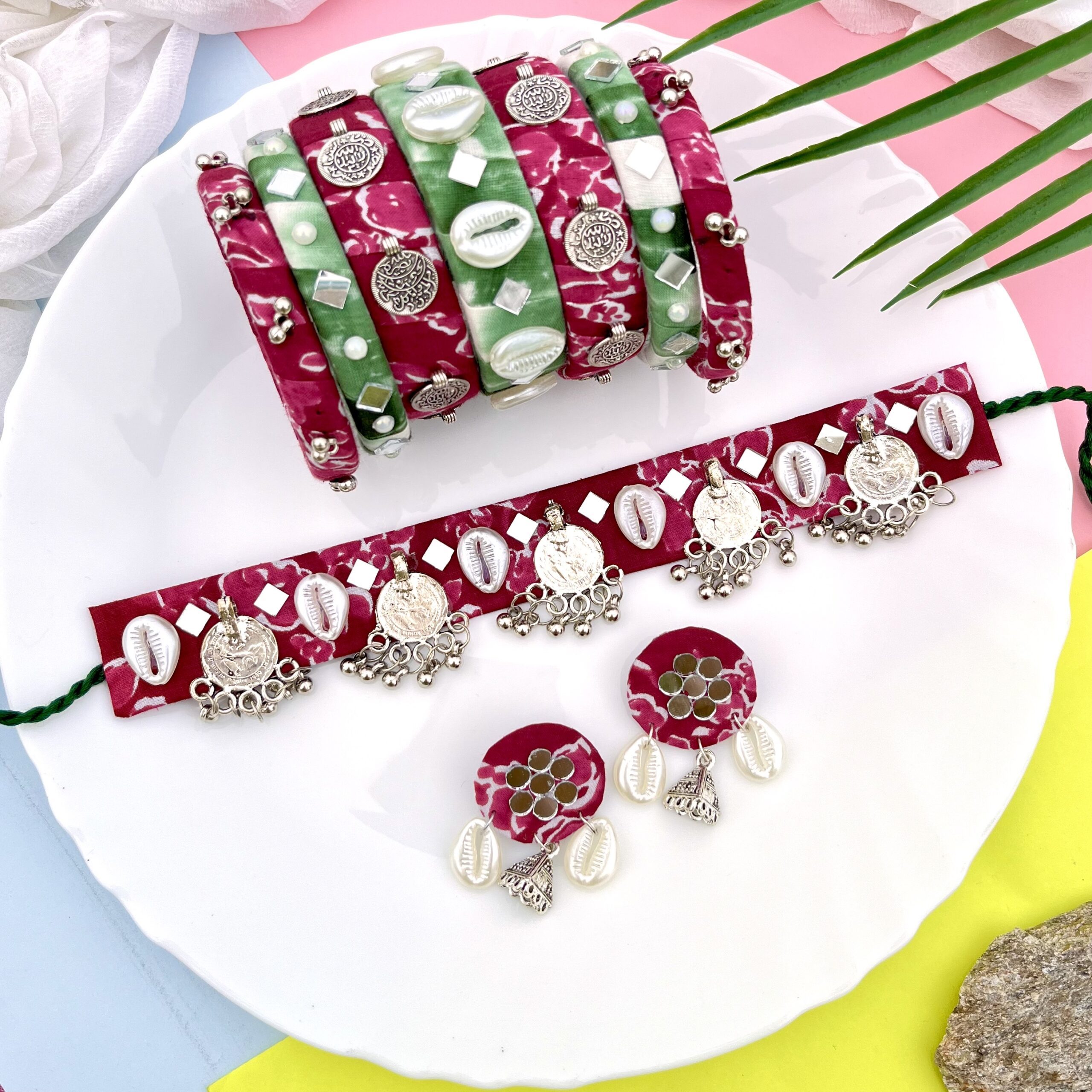 Adorn yourself in the golden hour glow with our Desi Dusk Choker Set – a stunning fusion of tradition and boho elegance. 🌙✨ Featuring intricately detailed shells, rustic ghunghroos, and antique coin charms, this set includes a bold choker, matching earrings, and statement bangles that echo the sound of culture and celebration.
