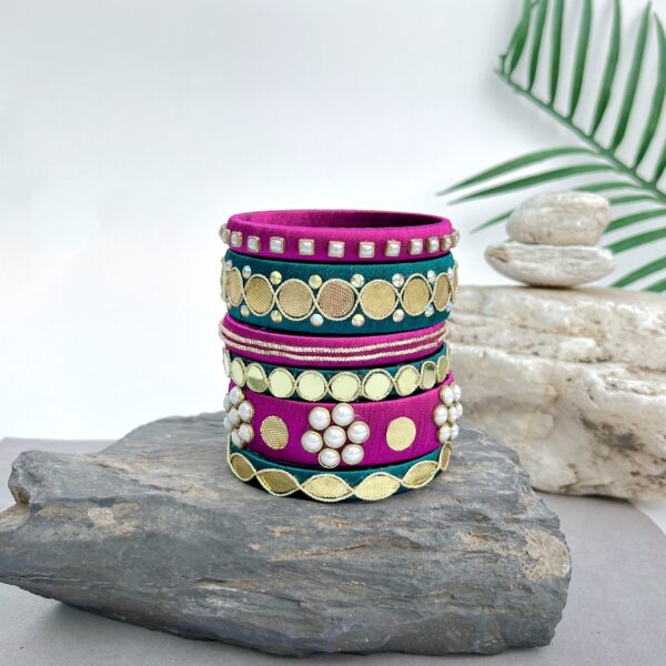 Elevate your festive look with our exquisite Riwayat Bangle Set – a perfect blend of tradition and elegance! Crafted in stunning green and dark magenta hues, adorned with intricate Gotta Patti work and shimmering Kundan detailing, this set is your go-to accessory for the upcoming celebrations. ✨