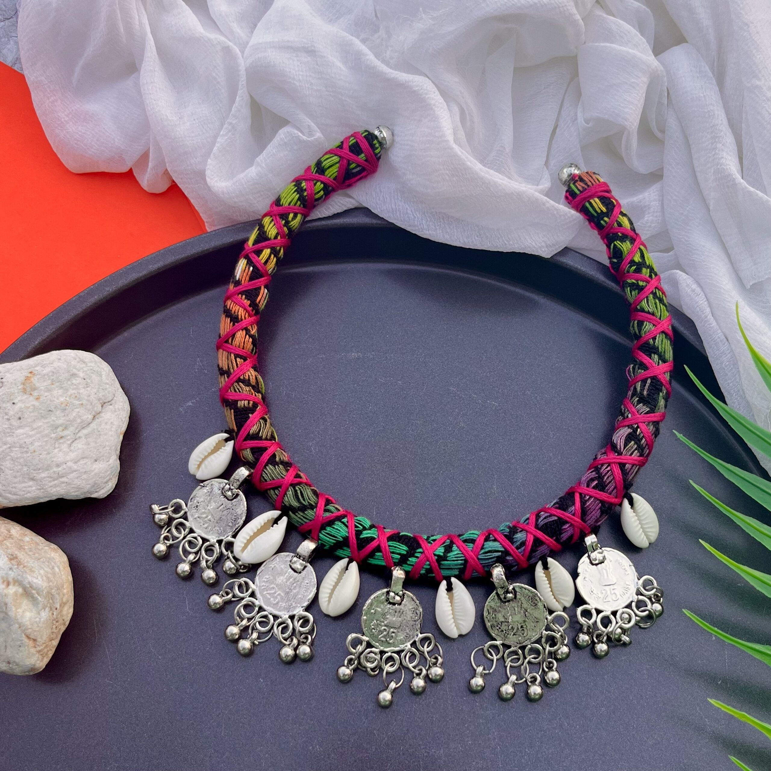 Our Shell Sutra Hasli is handcrafted with rich jacquard fabric, adorned with vintage coins and natural shells — a statement piece that speaks heritage with a hint of boho.